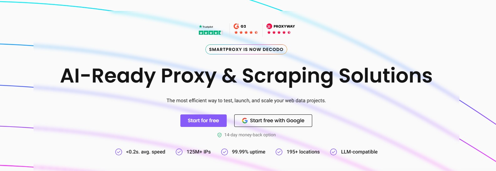 | Decodo | Residential, datacenter, ISP, mobile | 65+ million | HTTP, HTTPS, SOCKS | 99.99% | 99.47% | — | 4.6/5 | Only for residential proxies | Only for residential and mobile proxies | Starting from $7/GB |